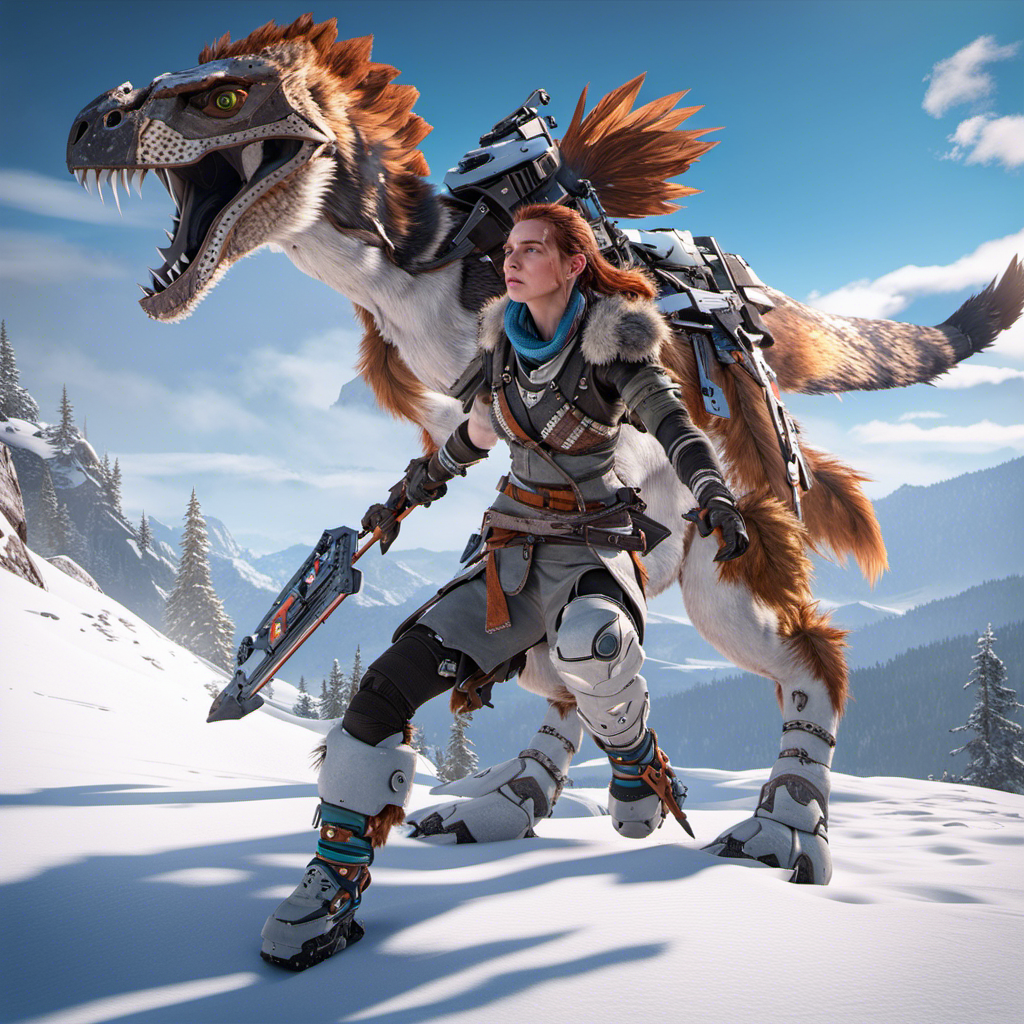 Aloy from Horizon Zero Dawn in the snowy norse mountains, fighting a robotic raptor from Horizon Zero Dawn, hyper realistic, ultra realistic, HDR, raytracing, octane render, UE5, autodesk 3D render, extreme detail, detailed face, detailed eyes, detailed robotic raptor, detailed hands, detailed arms, detailed spear that Aloy is holding