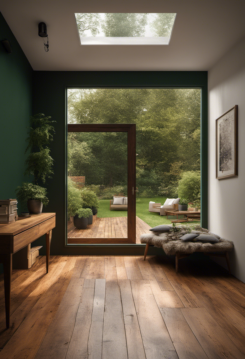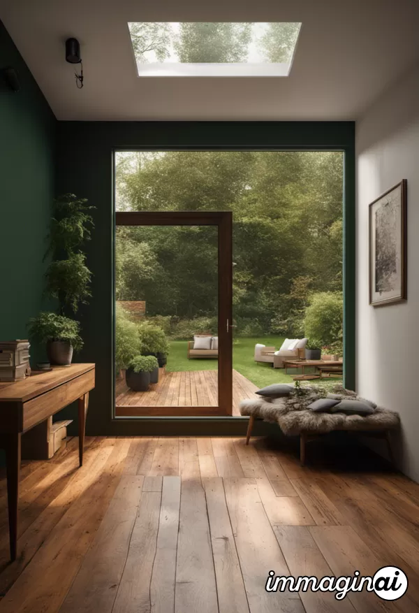 high resolution photography interior design, wooden floor, small windows opening onto the garden, low ceilings, dark green amber palette, interior design magazine, cozy atmosphere
