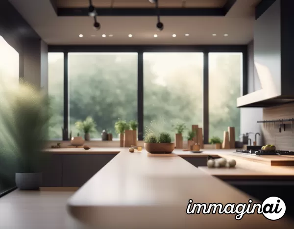 Large modern designer kitchen with large window overlooking minimalist garden, natural materials