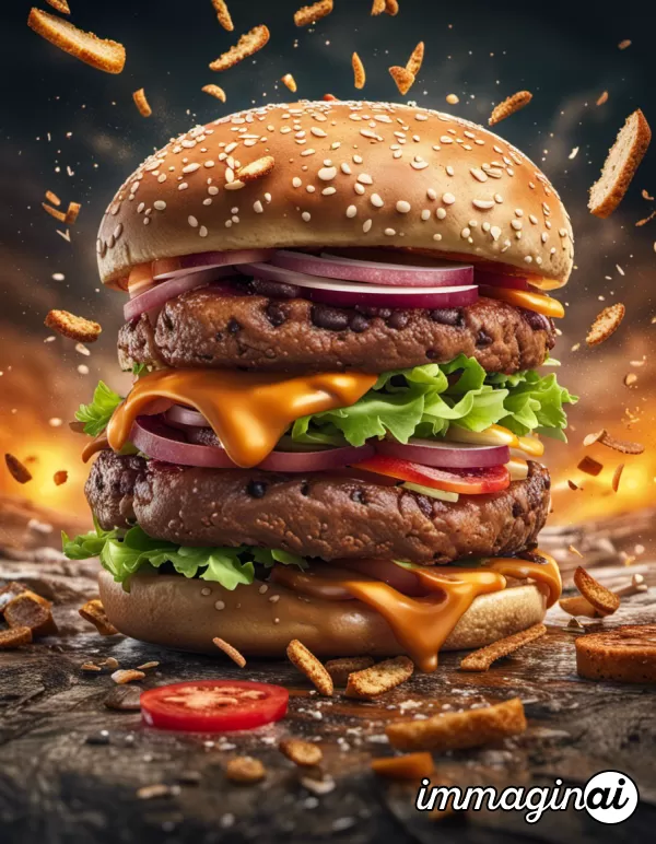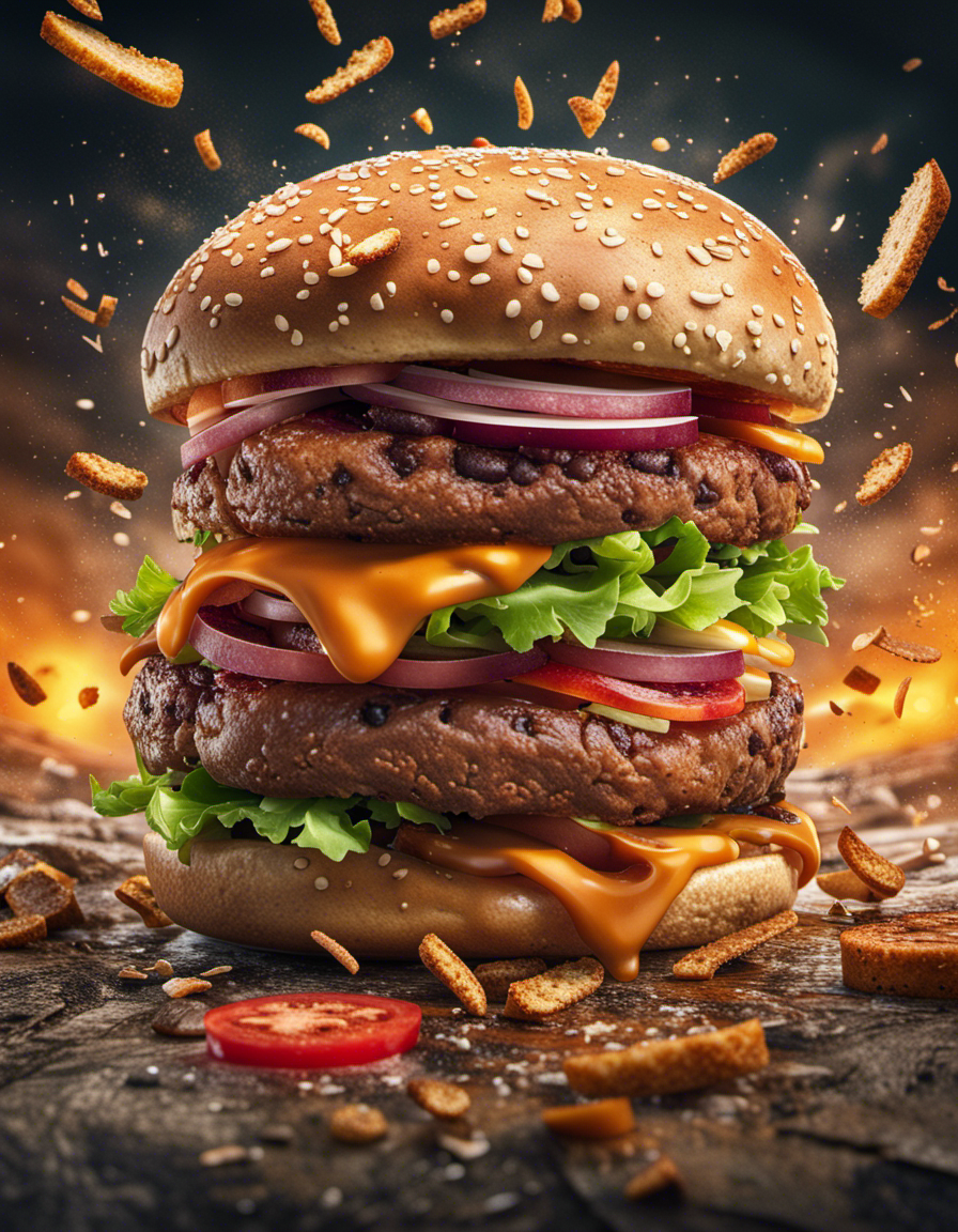 A burger falling in pieces juicy, tasty, hot, promotional photo, intricate details, hdr, cinematic, adobe lightroom, highly detailed